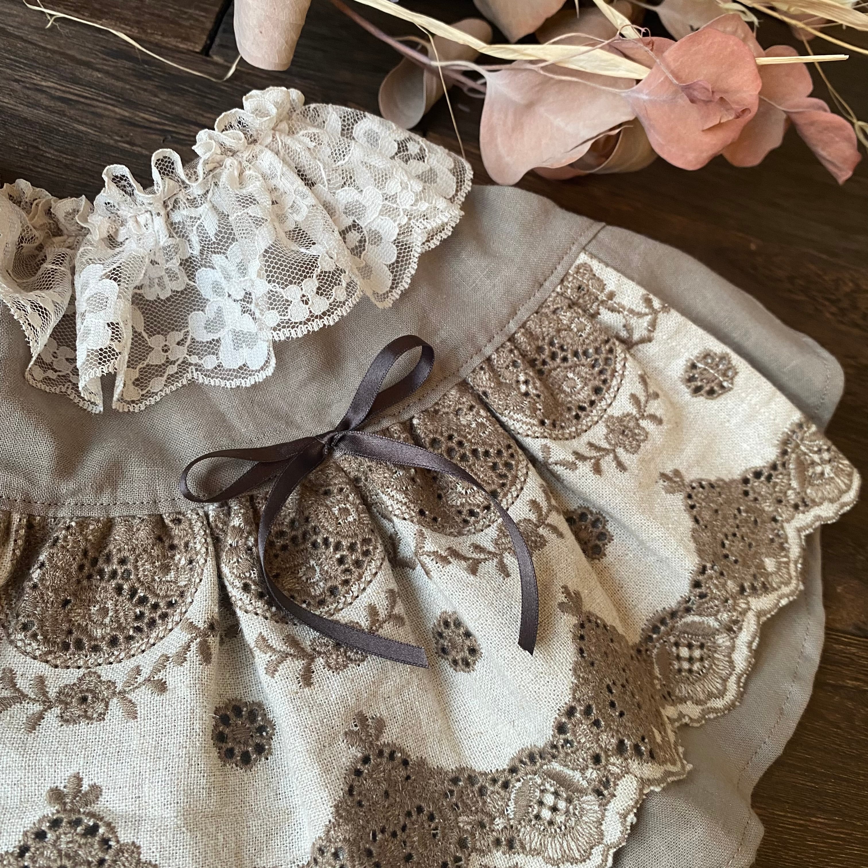 ふんわりコットンリネンのワンピースに、刺繍の入ったレース生地をエプロンに使用しました