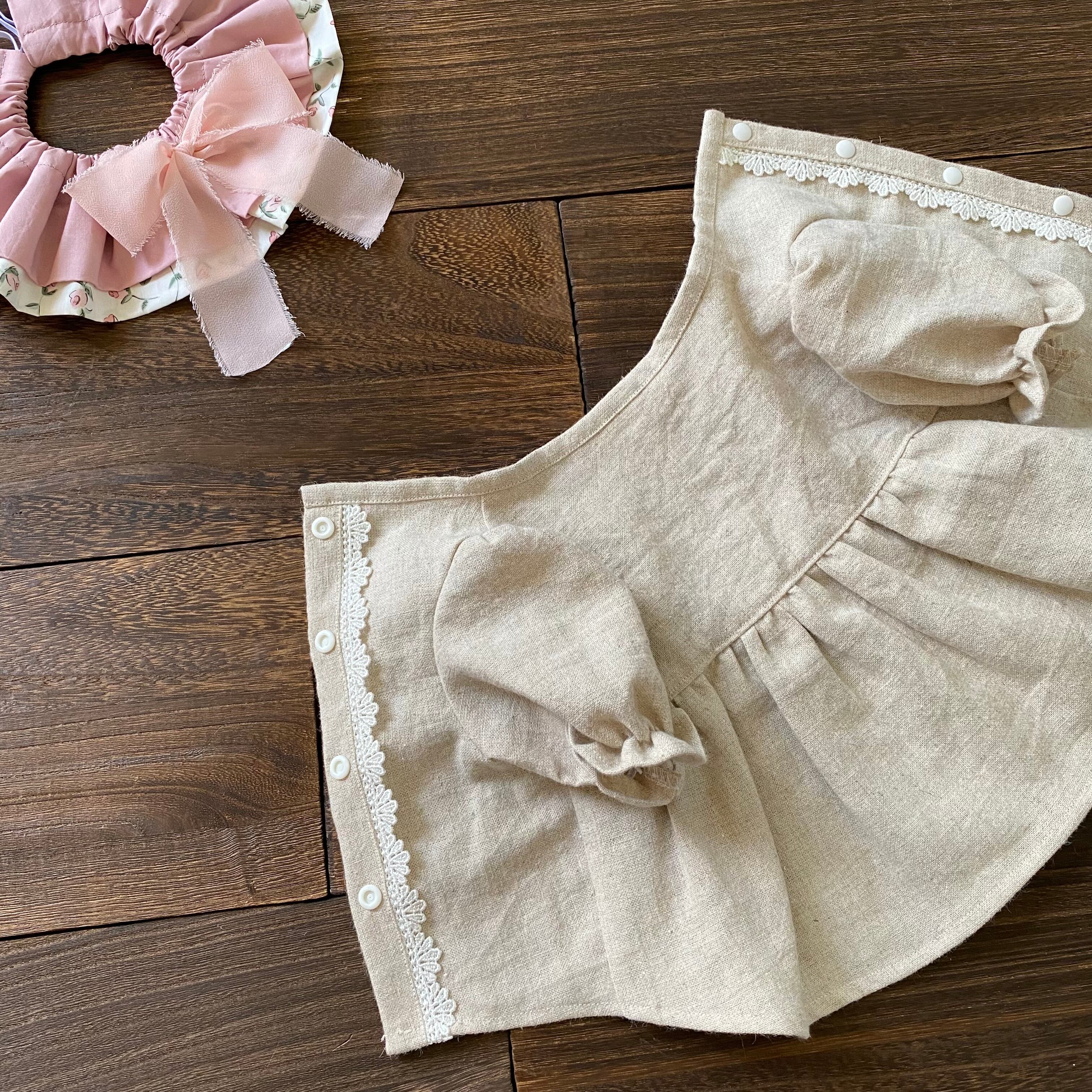 とってもシンプルなワンピースで、前ボタン箇所のみレースを付けました。さりげない可愛いさがポイントです❃︎